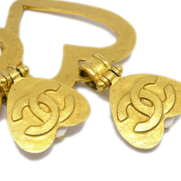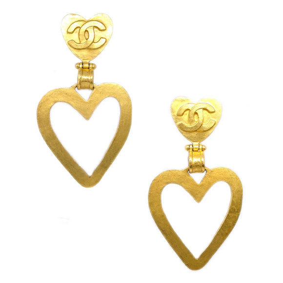 Chanel Heart Dangle Hoop Earrings Gold Clip-On 95P