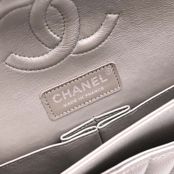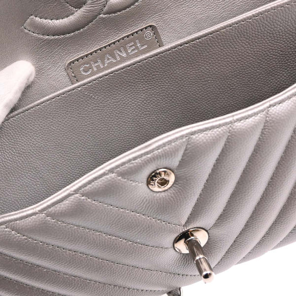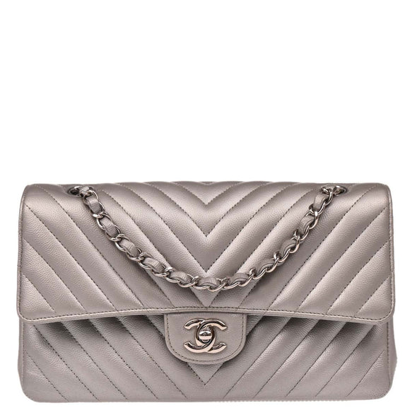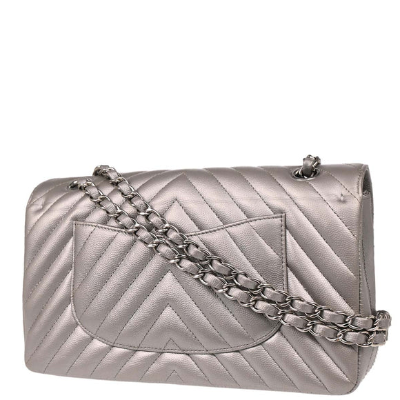 Chanel 2016-2017 Silver Caviar Chevron Medium Classic Double Flap Shoulder Bag