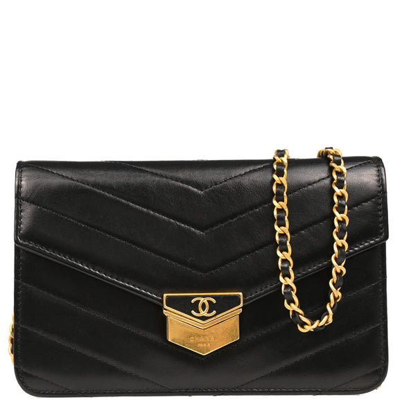 Check Chanel 2018-2019 Black Lambskin Chevron Medal Flap WOC Shoulder Wallet Bag