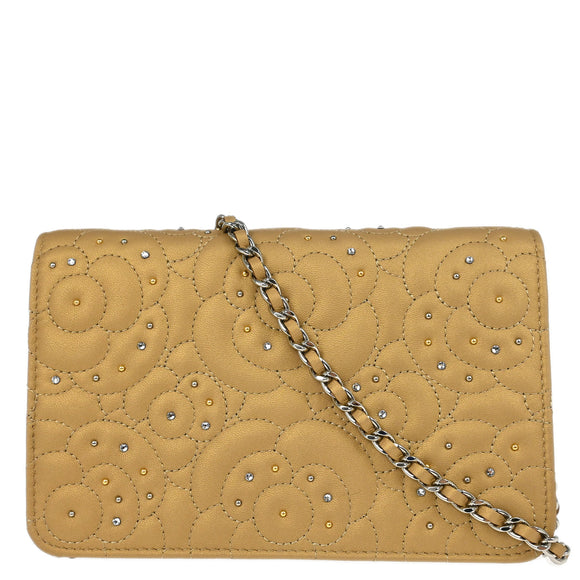 Chanel 2019 Beige Lambskin Rhinestone Camellia WOC Shoulder Wallet Bag