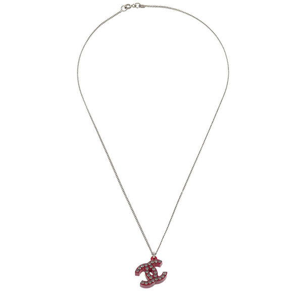 Chanel CC Chain Pendant Necklace Acrylic Silver Red 05P