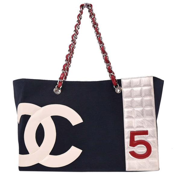 Chanel 2002-2003 Navy Silver Canvas No.5 Choco Bar Tote Handbag