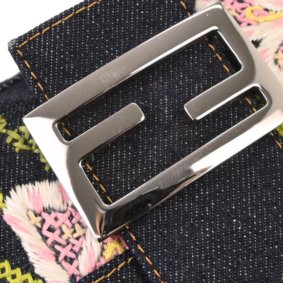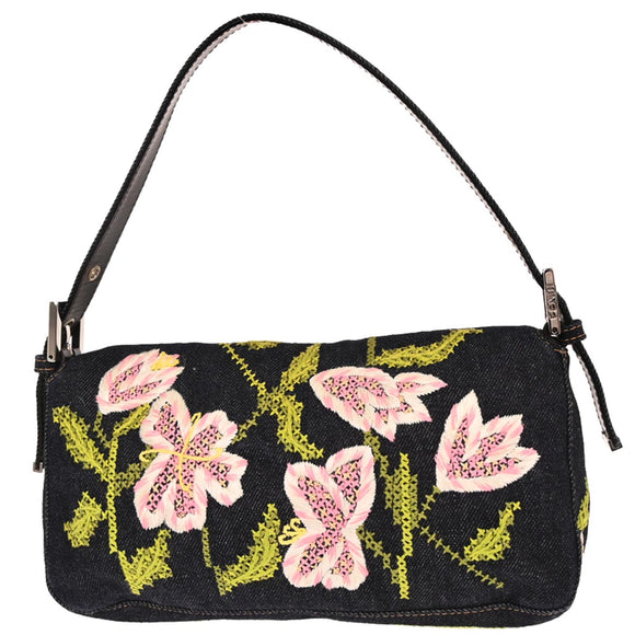 Fendi Navy Denim Flower Embroidered Baguette Handbag