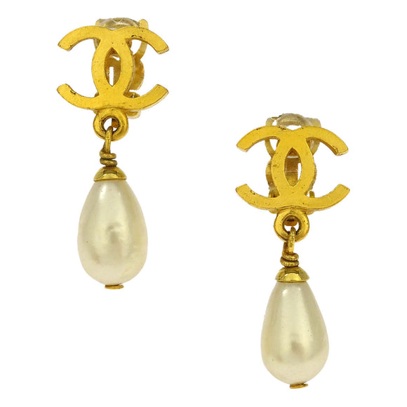 Chanel Gold CC Earrings Clip-On Dangle Costume Pearl 96P