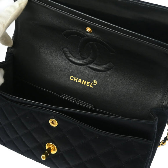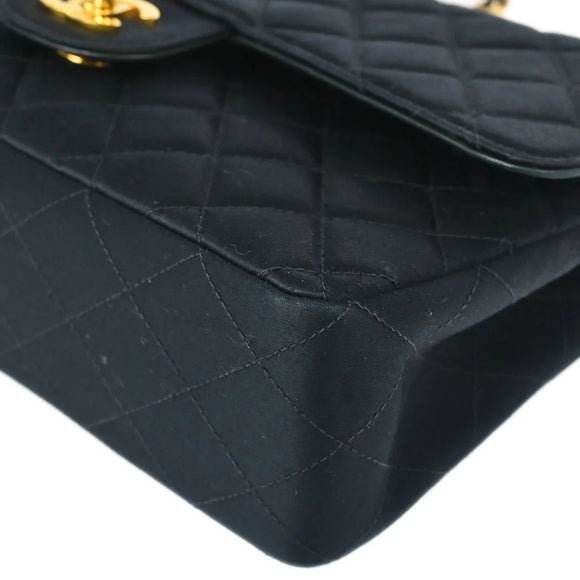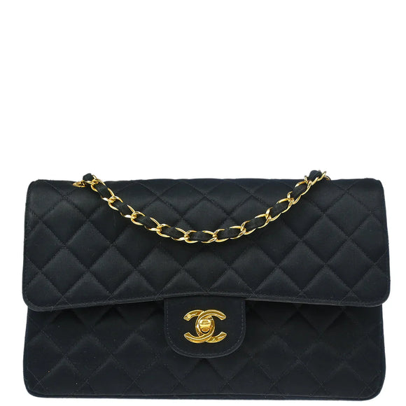 Chanel 1991-1994 Black Satin Medium Classic Double Flap Shoulder Bag